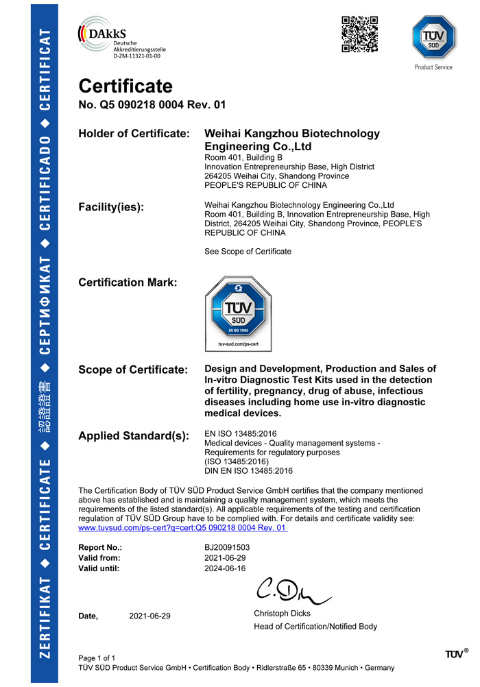? ? ?威??抵萆锕こ逃邢薰境闪⒂?013年,公司坐落于風景秀麗的海濱小城——威海市。康州生物是集研發(fā)、生產和銷售于一體的生物科技公司,與威海哈爾濱工業(yè)大學合作研發(fā)團隊,擁有先進的科研基地及生產基地。主要從事快速診斷檢測產品的研發(fā)、生產、銷售。產品涵蓋:生育檢測、藥物濫用檢測、農藥殘留檢測以及其他臨床診斷檢測等。公司自主研發(fā)生產得早早孕試紙,排卵檢測試紙,毒品檢測及疾病檢測等醫(yī)用產品,經過歐盟認證,產品質量穩(wěn)定,值得信賴。